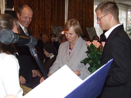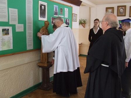 ![]() Następnie ksiądz Kazimierz Olszewski dokonał poświęcenia figury Świętego Maksymiliana oraz pracowni komputerowej. Do młodzieży zwrócił się obecny na uroczystości prezes TONO Władysław Gołąb i przedstawiciel zakonników z Niepokalanowa profesor Ojciec Roman Soczewka, który wręczył szkole pamiątkowy medal oraz cenne książki o życiu męczennika.