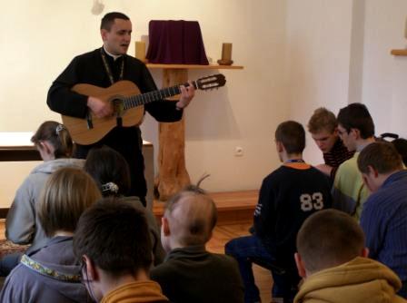 Nasz rekolekcjonista prowadził nas przez różne krainy. Pierwsza kraina wypełniona była po brzegi słowami. Przedziwna kraina. Potem Ksiądz Michał mówił nam o złym królewiczu, który przemienił się w mądrego władcę. Inne historie opowiadały o zagubionym kotku i Agatce, o porwaniu dzieci i wielkiej miłości matki, która je uratowała. Od czasu do czasu historie przerywane były wspólnym śpiewem. Ksiądz Michał grał na gitarze i zupełnie nie spodziewał się, że nasz kolega Damian przyniesie mały bębenek. I tak rozpoczęliśmy śpiew, który dotykał nieba!
