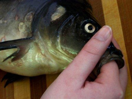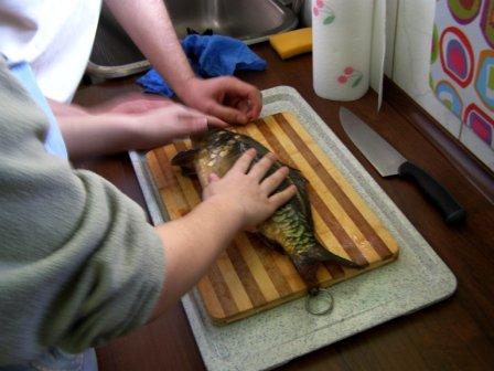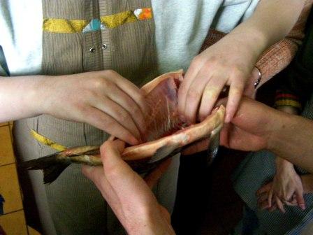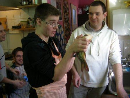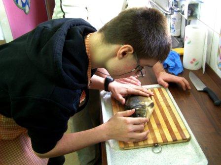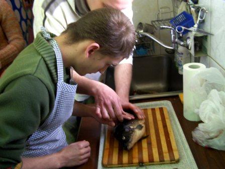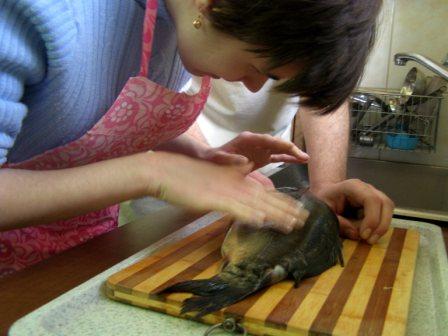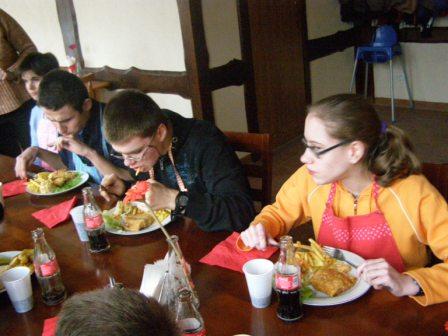 Następnie można było dokładnie obejrzeć, czyli, używając naszego języka, "obrajlować" karpia, zarówno z wierzchu, jak i od środka. Kolejny etap zajęć to samodzielne złożenie zamówienia: trzeba było wybierać z trzech rodzajów ryb, trzech dodatków, dwóch surówek i trzech napojów. Niektórzy uczniowie po raz pierwszy w życiu samodzielnie decydowali o tym, co zamówią. Na zakończenie była już tylko konsumpcja... mniam, mniam... Taka lekcja wszystkim bardzo przypadła do gustu. |