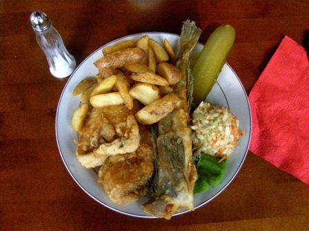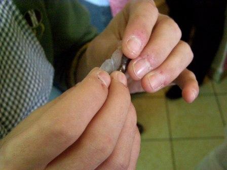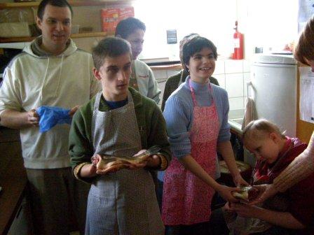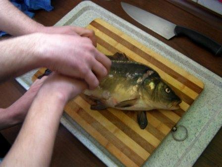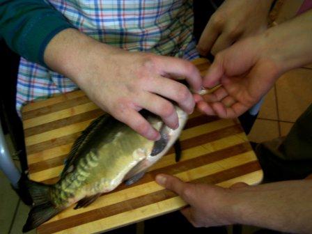 Następnie można było dokładnie obejrzeć, czyli, używając naszego języka, "obrajlować" karpia, zarówno z wierzchu, jak i od środka. Kolejny etap zajęć to samodzielne złożenie zamówienia: trzeba było wybierać z trzech rodzajów ryb, trzech dodatków, dwóch surówek i trzech napojów. Niektórzy uczniowie po raz pierwszy w życiu samodzielnie decydowali o tym, co zamówią. Na zakończenie była już tylko konsumpcja... mniam, mniam... Taka lekcja wszystkim bardzo przypadła do gustu. |