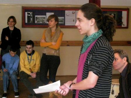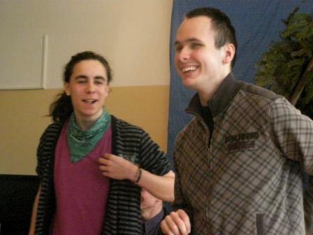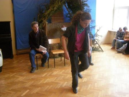 Pokazywałem młodzieży specjalne obuwie, podkute blachami. Wywołały one wielkie zdziwienie, gdyż chodzenie w podkutych butach wydało im się dość dziwne. Jednak kiedy zacząłem stepować ujrzałem na ich twarzach radość i zrozumienie po co są one podkute. Po krótkim pokazie, zorganizowałem parę konkursów. Ochotnicy mogli się nauczyć kilku podstawowych kroków, które dla nich okazały się bardzo trudne. Mogli odgadywać imiona wystukiwane przeze mnie stopami, a przeliczaliśmy to na punkty brajlowskie. Na samym końcu zostałem mile zaskoczony, gdyż poddano mnie próbie. Daniel wygrywał rytm na bębnie, a ja miałem go zatańczyć, jednak wygrywał w takim tempie, iż nie dałem rady się dołączyć. Michał Wierzbowski |